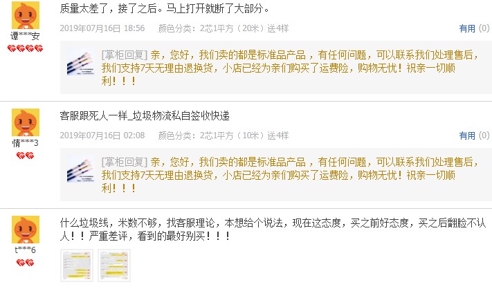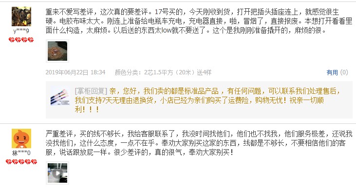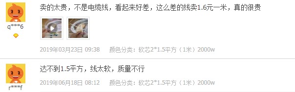 某寶銷量最好2家1家某品牌工廠店1家是個人店鋪,rvvb2*1.5  1.6每米還包郵,rvs2*1.5  1.4每米包郵,是不是很心動,是不是想買,當你看到下面的客戶評價時,只能感覺現在的商家良心真的被狗吃了!