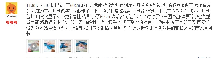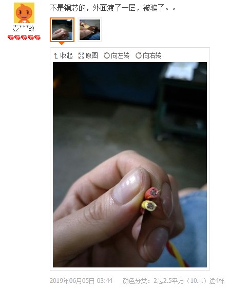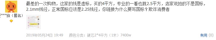 評價截圖有很多,我這邊就不一 一發(fā)出來了,總結幾個特征,冒充國標,截面積虛標,米數不足,導體斷線,鋁鍍銅,這個就是低價的本質,如果你是買回家當擺設并且不怕刺鼻味的,盡可能多買點,其余用途作為晾衣繩都怕斷。